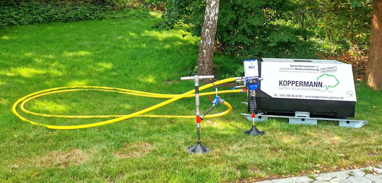In Bestandsflächen oder Flächen mit einer tiefliegenden Verdichtung, könne wir mit unserer Druckluftlanze zum Einsatz kommen. Unser spezieller Kompressor läuft, anders als bei herkömmlichen, mit Bio- Öl. Somit können wir versichern, dass nur saubere Luft in den Boden gepustet wird. Über Schläuche und den dazugehörigen Lanzen können wir flexibel bis in die kleinste Gartenecke gelangen und den Boden optimieren.