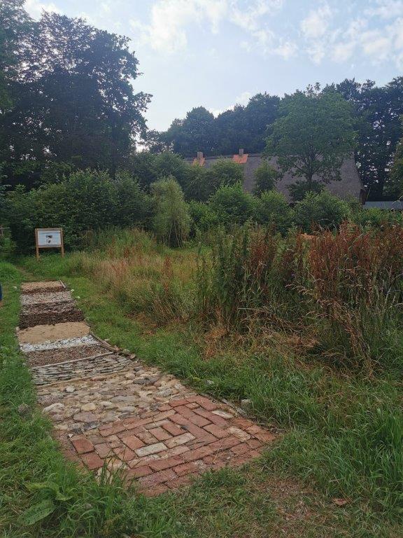 Der Entwurf, welcher auf Grundlage der Planung von Herrn Hein Benjes basiert, galt beim Abstecken der Wegflächen eher als Richtlinie. Alle Feinheiten und genauen Punkte für Abzweigungen und Co. wurden vor Ort und mit den Mühlenfreunden abgesprochen.
